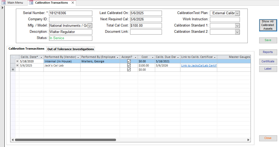 - Record 3rd party and internal calibration certificates